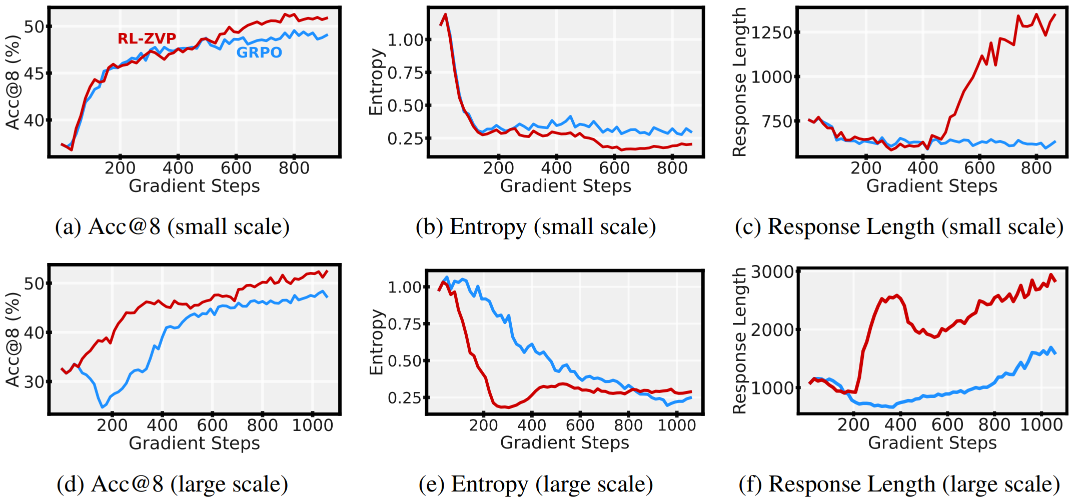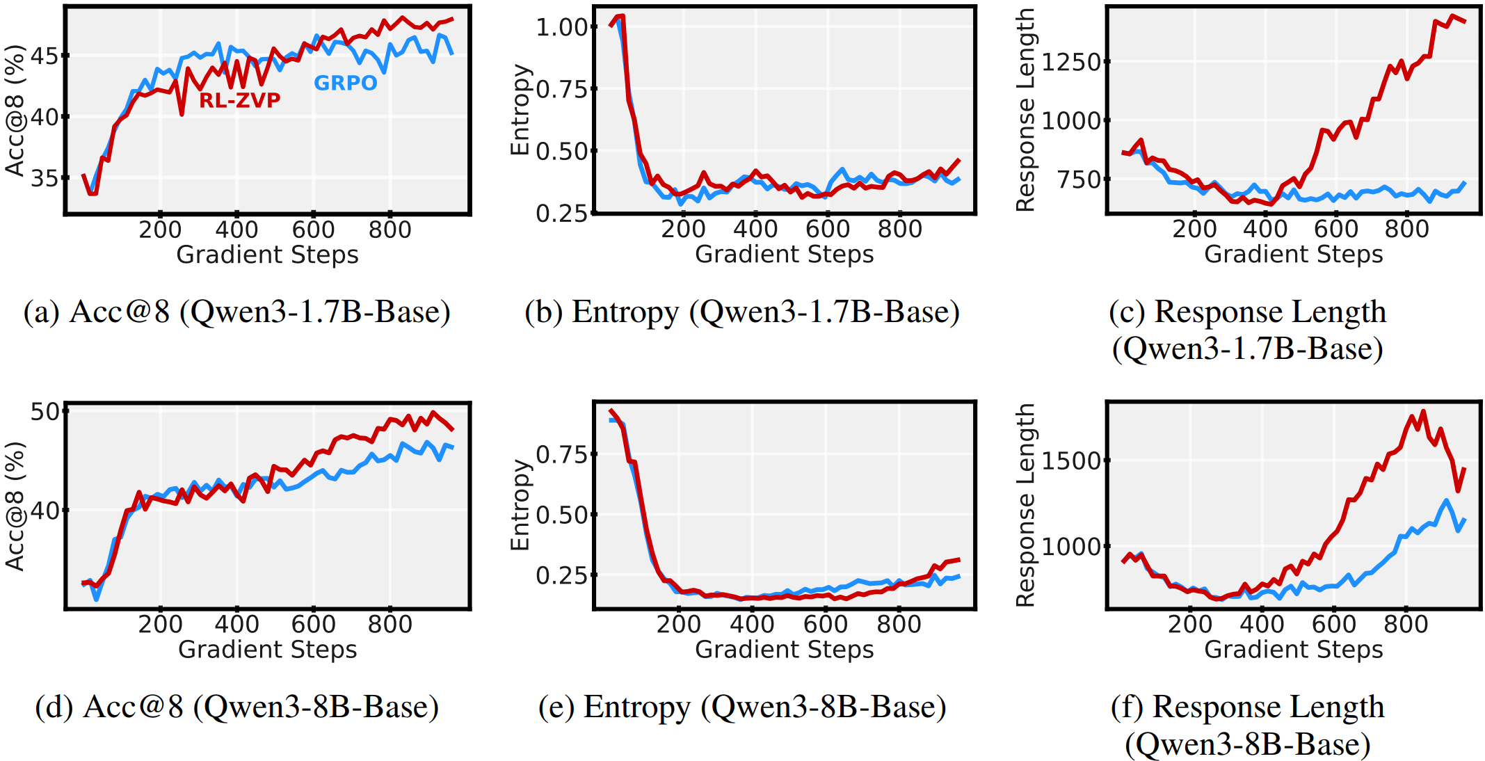 Validation accuracy and training dynamics at different experiment scales. Each row shows Acc@8, entropy, and response length during training for Qwen3-1.7B-Base (top) and Qwen3-8B-Base (bottom). RL-ZVP exhibits more consistent and stable trends than GRPO.