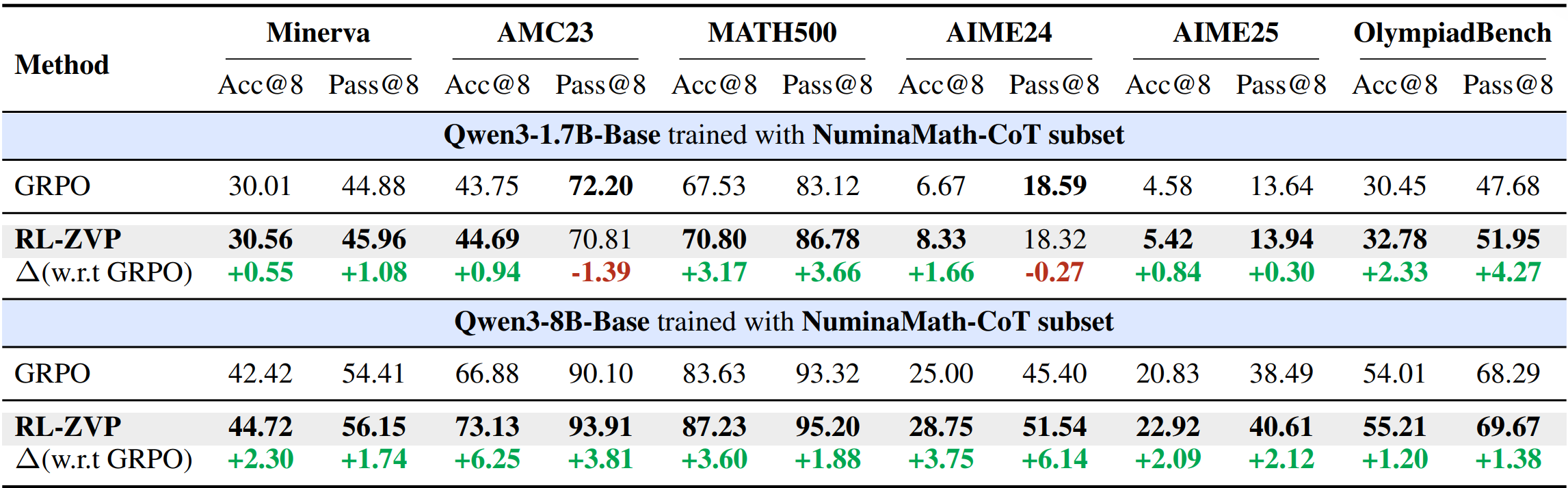 RL-ZVP shows significant effectiveness on six math reasoning benchmarks:
