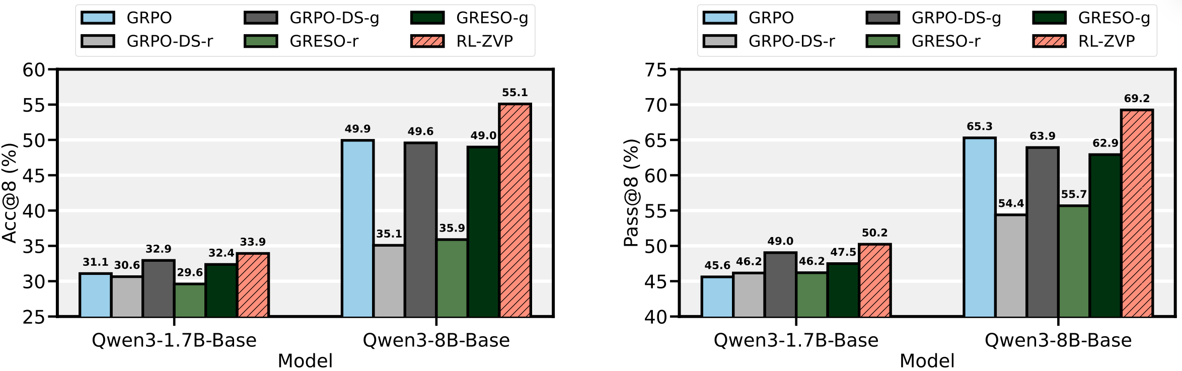 Average accuracy (a) and pass rate (b) on six math reasoning benchmarks across model scale and training methods. RL-ZVP consistently delivers the strongest performance among all baselines.