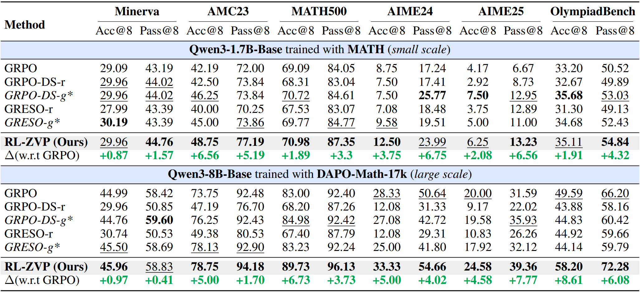 Detailed evaluation results on six math reasoning benchmarks. The best and second best performance across all settings are bold and underscored, respectively. Under a fair setup of equal rollout budget, RL-ZVP achieves the best performance across all datasets, heavily outperforming GRPO. (*) Even in the unfavorable setting where Dynamic Sampling baselines use 3 to 5 times more rollouts, RL-ZVP still outperforms them on the majority of benchmarks.