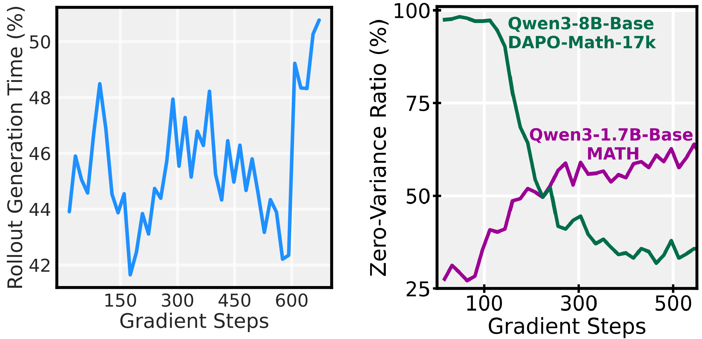 Left: Rollout generation overhead as a percentage of total training step time. Right: The percentage of zero-variance prompts. Post-rollout filtering still incurs massive overhead on the policy training, while pre-rollout filtering ignores potential learning signals from zero-variance prompts.